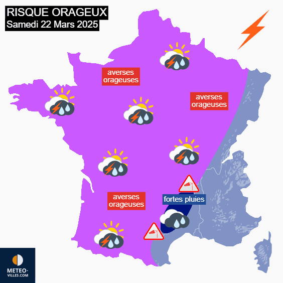 La journée du samedi 22 mars 2025 sera instable sur une grande partie de la France, exposée au déclenchement d'averses. Celles-ci pourront tourner à l'orage de manière ponctuelle avec un risque concernant une grande partie du territoire, à l'exception du flanc est. Ces orages devraient demeurer faibles à modérés. Sur les Cévennes, les fortes pluies persisteront avec des cumuls notables mais - a priori - sans atteindre des niveaux inquiétants