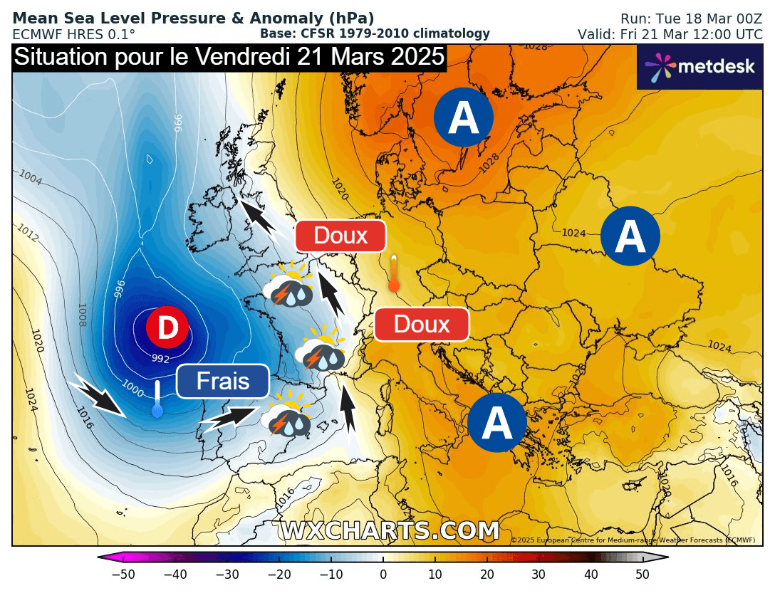 Dans les prochains jours, une dépression issue d'une masse d'air froid venue du nord de l'Atlantique se creusera au large du Portugal. Dans le même temps, l'anticyclone dominera sur l'Europe centrale et la Scandinavie. Soumise à un flux de sud-est très doux, la France va connaître une dégradation liée à l'approche des basses pressions océaniques. Le contraste entre l'air frais sur le golfe de Gascogne et l'air doux sur notre pays va induire un contexte propice aux averses et aux orages dès le vendredi 21 mars 2025.