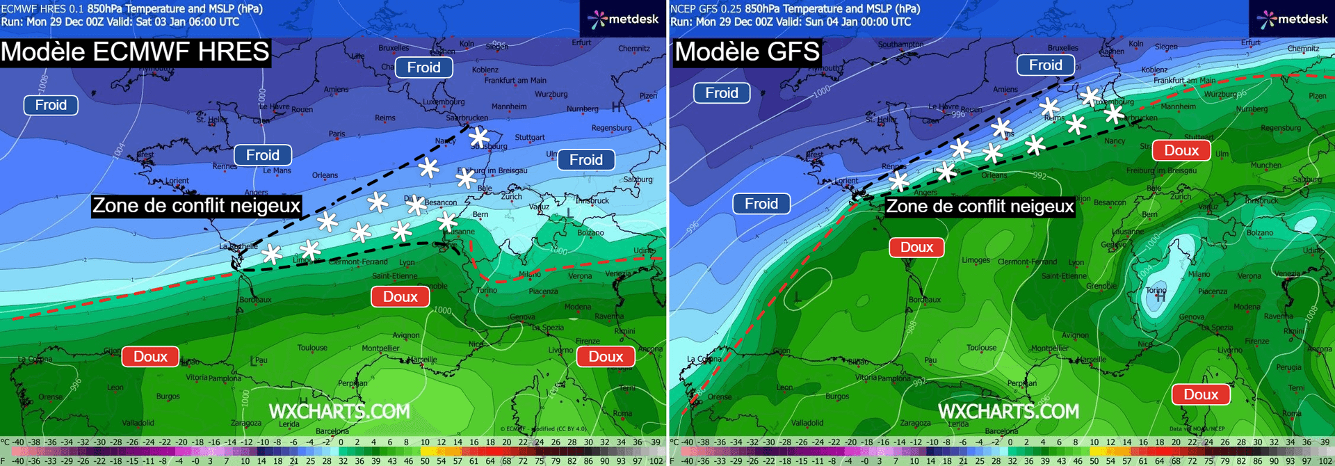 Deux scénarios possibles pour la journée du samedi 3 janvier 2026 sur la France – Modèles ECMWF HRES et GFS via WX CHARTS