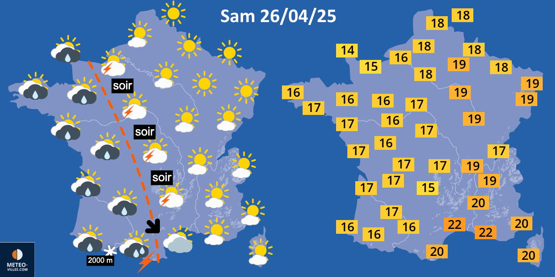 La journée du samedi 26 avril 2025 s'annonce plaisante dans le nord et l'est de la France où de généreuses éclaircies domineront les débats, associées à des températures douces en après-midi (18-19°C en général). En revanche, de nombreux nuages gagneront l'ouest du pays où ils seront accompagnés d'averses. En seconde partie de journée, certaines pourront adopter un caractère orageux local avec un risque s'étendant au centre de la France en soirée. Sous ces nuages et ces averses, les températures seront moins élevées dans la moitié ouest (15-17°C).