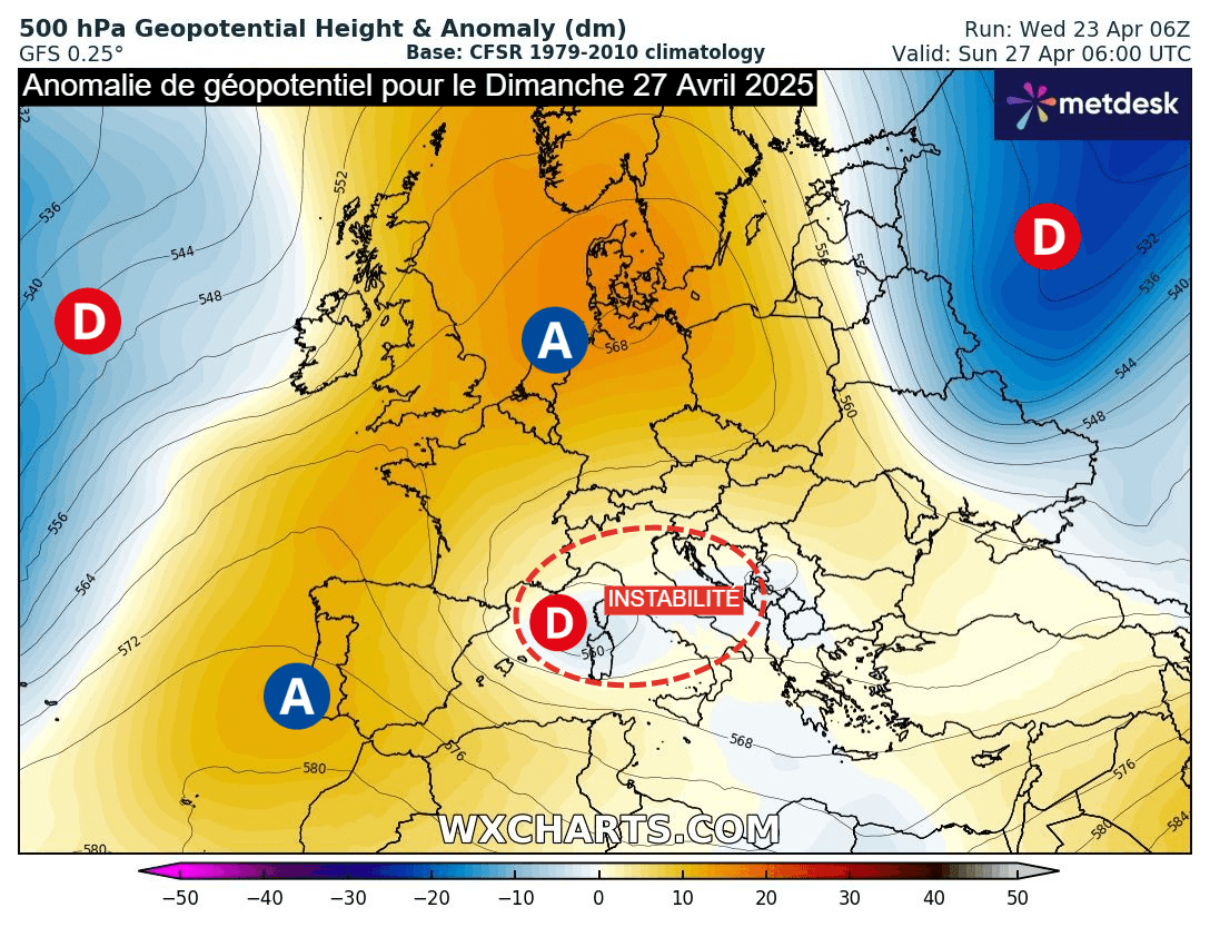 Si l'échéance est raisonnable, quelques incertitudes subsistent encore quant aux prévisions de ce week-end des 26 et 27 avril 2025. En effet, un talweg sur le proche-Atlantique devrait engendrer une petite goutte froide d'altitude, venant se positionner vers la Corse dimanche 27 avril. Celle-ci sera probablement à l'origine d'averses dans l'ouest samedi puis au sud-est dimanche mais l'extension géographique et l'intensité de l'instabilité restent à préciser car la goutte froide est un phénomène volatile et de petite échelle, causant des divergences jusqu'à court terme.