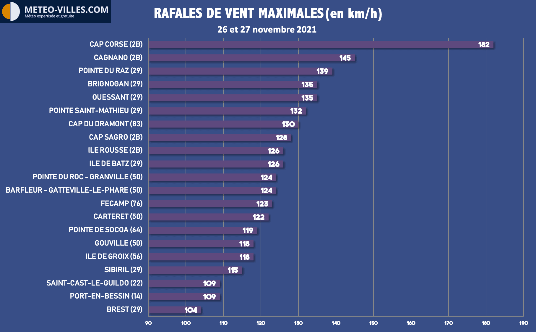 A noter que le flux de Nord à Nord-Ouest qui accompagne cette humidité et cet air froid a été assez virulent. Les vents ont été en effet violents le long des côtes de la Manche et sur le Finistère avec des rafales ayant atteint les 130km/h. L'île de beauté a également été concernée avec une rafale de 182km/h observée au Cap Corse.
