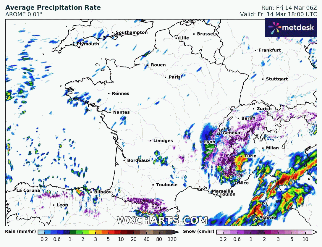 Animation du risque de pluie et de neige du 14 au 16 mars 2025 – Modèle arome via meteociel.fr