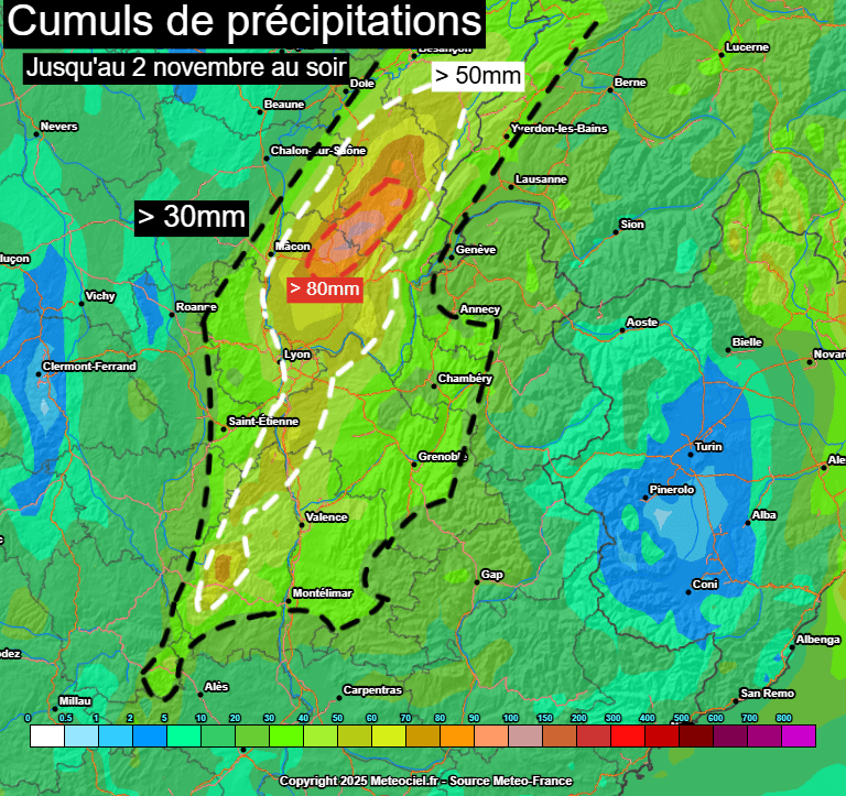 Différents cumuls de précipitations envisagés sur le centre-est de la France d'ici le dimanche 2 novembre au soir – Via meteologix