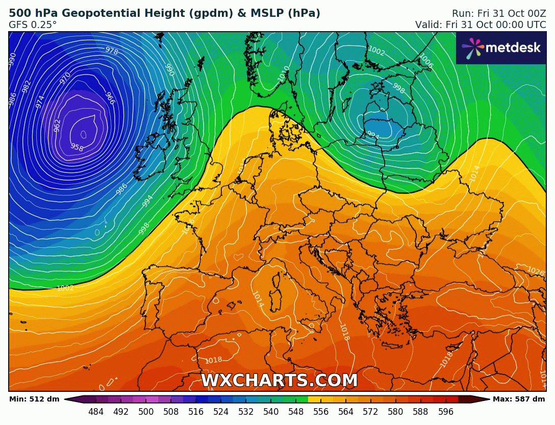 Animation des géopotentiels à 500hPa sur l'Europe du 31 octobre au 3 novembre 2025 – Modèle GFS via WX CHARTS