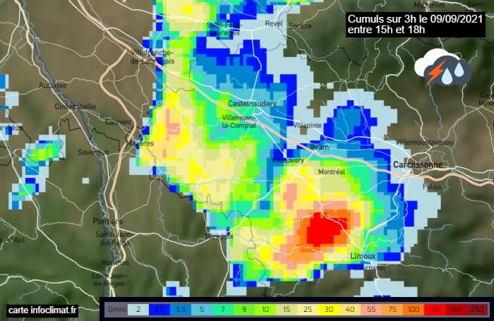 Cumuls de pluie sur 3h dans l'Aude le jeudi 9 septembre 2021 entre 15h et 18h - via infoclimat.fr