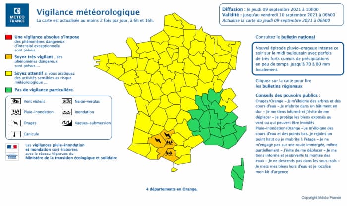 Carte de vigilance valable pour le jeudi 9 septembre 2021 - via Météo France