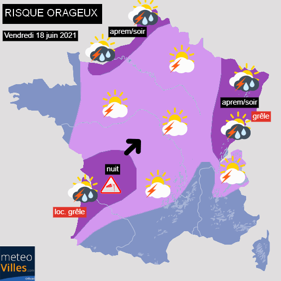 Prévision du risque orageux pour la journée du vendredi 18 juin 2021 et la nuit suivante - Météo Villes