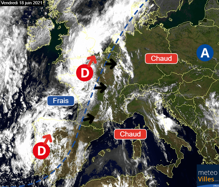 Image satellite légendée montrant le conflit mise en jeu sur la France ce vendredi 18 juin – EUMETSAT, modifié par Météo-Villes
