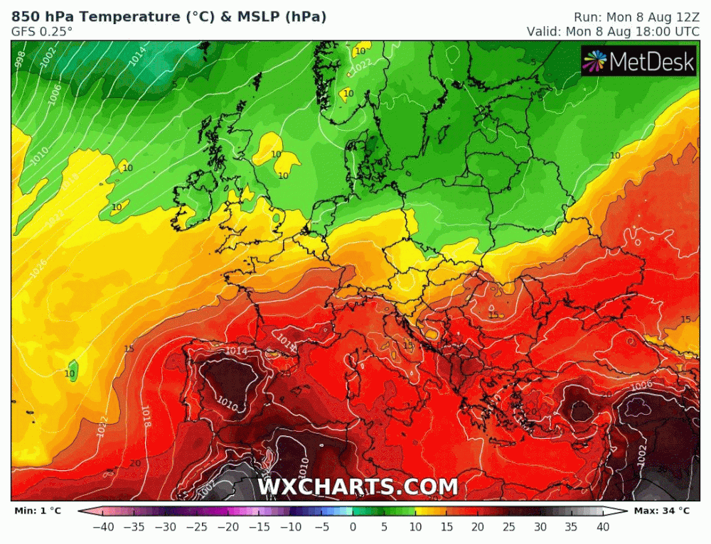 Masse d'air à 850 hPa (vers 1500m) du lundi 8 au dimanche 14 août 2022 - via wxcharts.com