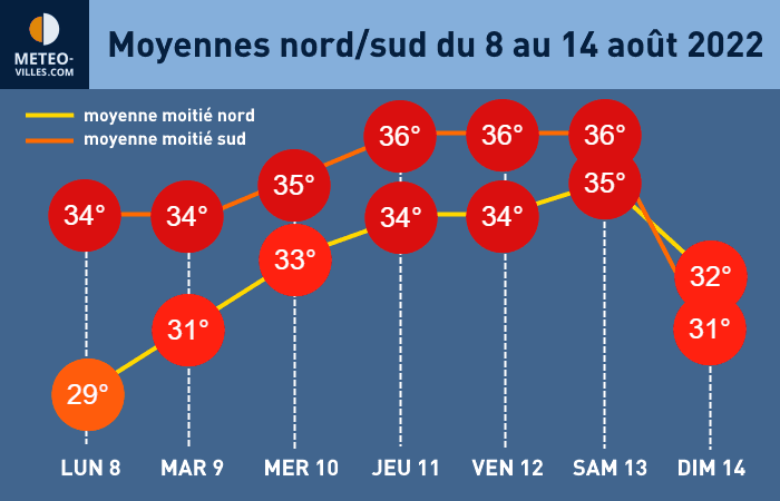 Températures moyennes nord/sud en France du lundi 8 au dimanche 14 août 2022 - Météo Villes
