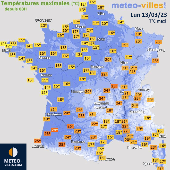 Températures maximales mesurées ce lundi 13 mars 2023 - Météo Villes