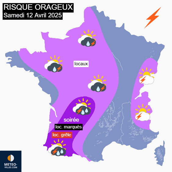 L'instabilité fera son retour dès la journée du samedi 12 avril 2025 avec le déclenchement d'averses dans l'ouest et le centre de la France. Celles-ci seront susceptibles d'adopter un caractère orageux local. Le risque orageux sera plus net en fin de journée entre l'Aquitaine et le Limousin avec des orages localement marqués, pouvant produire des pluies intenses parfois mêlées de grêle. Notons que quelques averses orageuses pourront aussi se développer sur les reliefs de l'est.