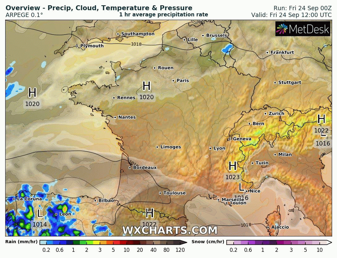 Animation des précipitations et de la pression atmosphérique sur la France entre le vendredi 24 et le dimanche 26 septembre 2021 – Modèle Arpège via WX CHARTS