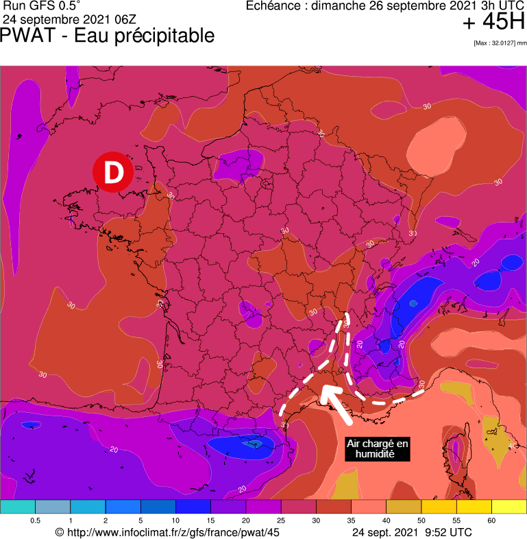 Contenu en eau précipitable sur la France durant la nuit du samedi 25 au dimanche 26 septembre 2021 – Infoclimat.fr, modifiée par Météo-Villes