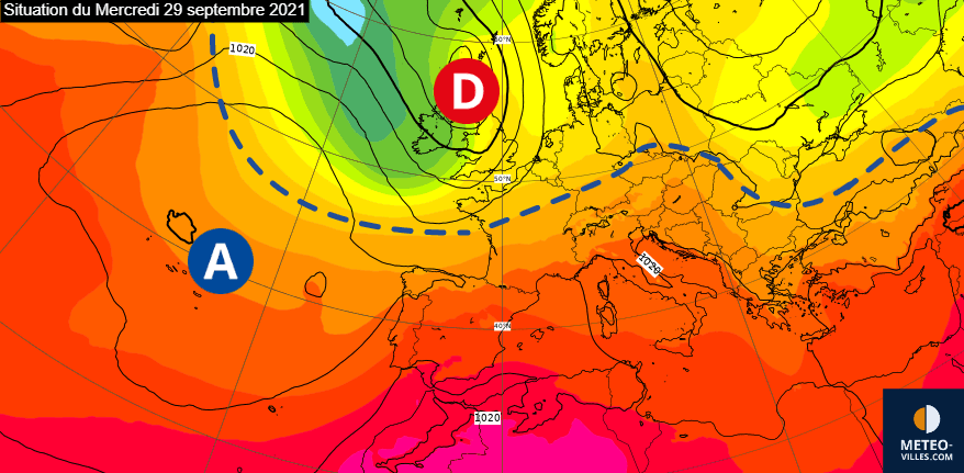 Situation atmosphérique du mercredi 29 septembre 2021 sur l'Ouest de l'Europe - ECMWF, modifié par Météo-Villes
