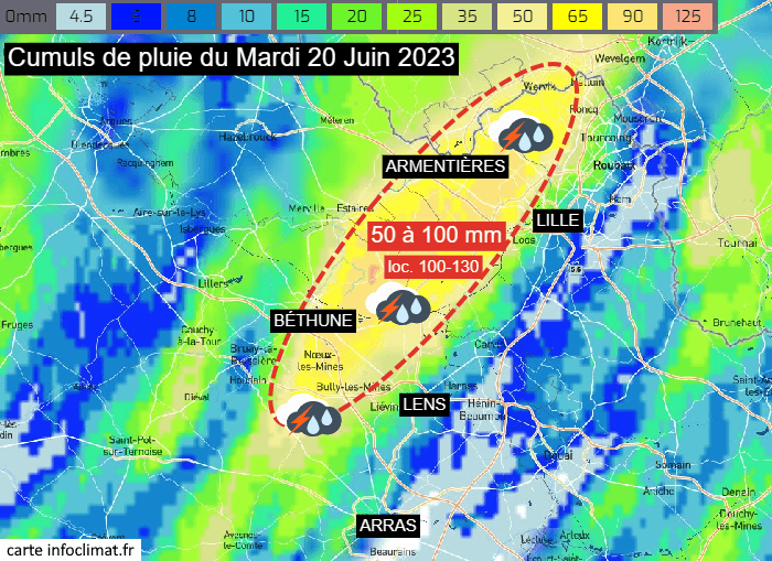 Cumuls de pluie du mardi 20 juin 2023 sur le centre du dans le Nord-Pas-de-Calais - via infoclimat.fr