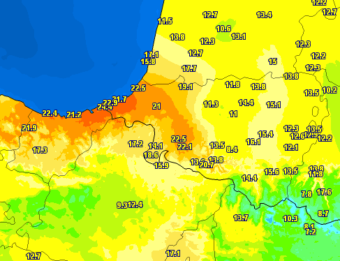 D'autres minimales très douces ont été enregistrées sur des stations secondaires comme +22.5°C aussi à Bustince, +22.1°C à Mendive et +21.7°C à la Pointe de Socoa... Tous côtés français.