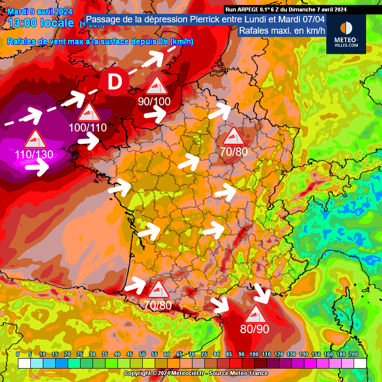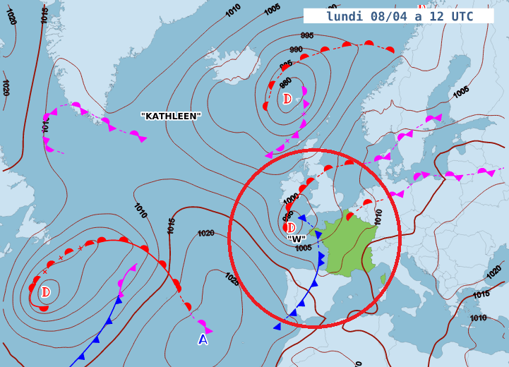 La dépression Pierrick arrive avec un vaste front froid à la mi-journée du lundi 08 avril - MeteoFrance