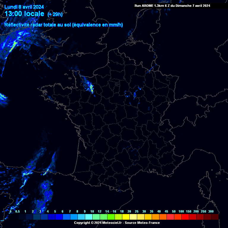 Localisation des orages durant la journée du lundi 08 avril 2024 - Les orages apparaissent en orange et rouge - Arome/MeteoFrance/Meteociel