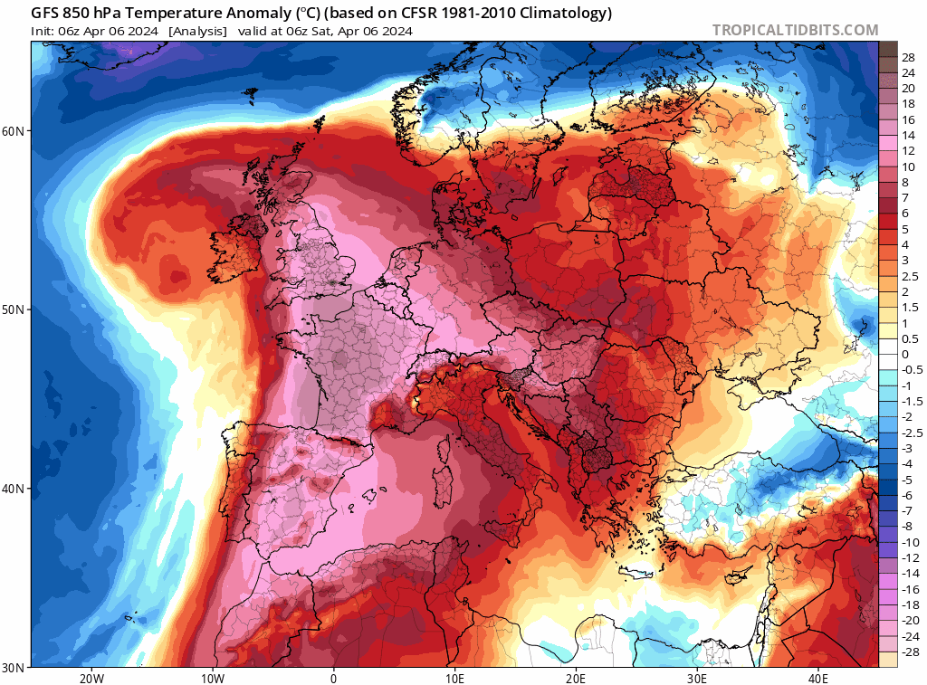 La journée s'est ouverte avec des minimales inégalées en France pour un mois d'avril. Les températures ne sont pas descendues sous les +22.5°C à Biarritz, +22.9°C à Hendaye et la minimale officielle la plus haute concerne la rive espagnole avec +24.4°C à San Sabastian... Mais il n'y aura pas fait moins de +25°C durant la nuit du 5 au 6 avril!