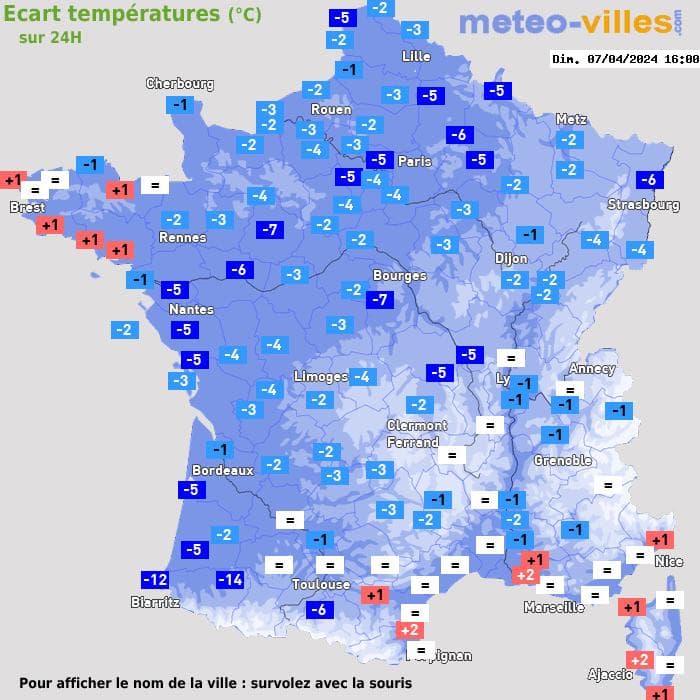 Variation des températures en 24h entre samedi 16h et dimanche 16h - MeteoVilles