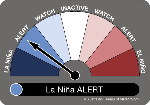 En Australie, le Bureau of Meteorology a émis une alerte concernant une probabilité de 70% que le phénomène de La Niña soit déclaré d'ici la fin de l'année, soit seulement la 3ème fois que ce phénomène se produit durant l'été durant 3 années consécutives.