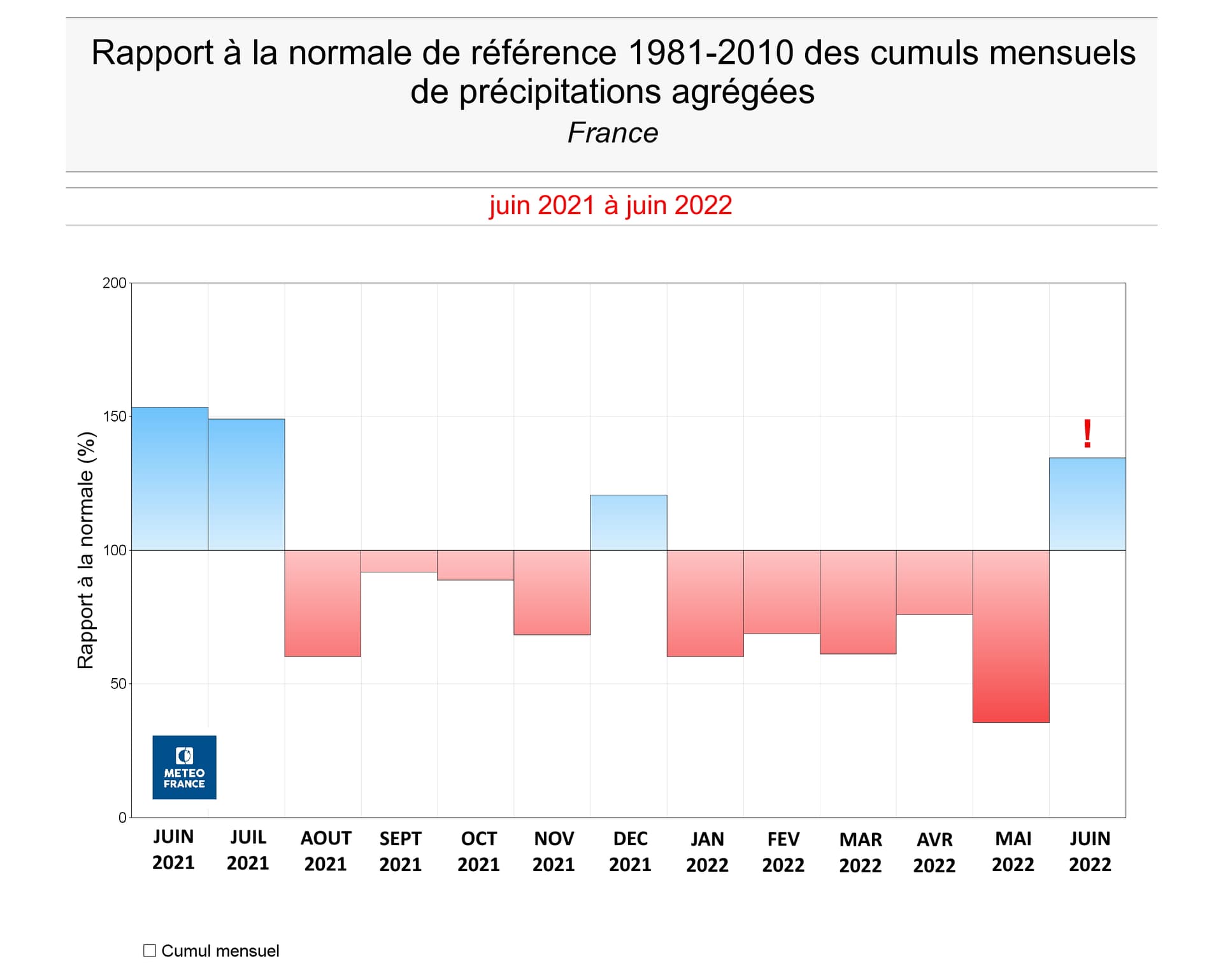 Rapport à la normale des précipitations en France de juin 2021 à juin 2022 - via Météo France