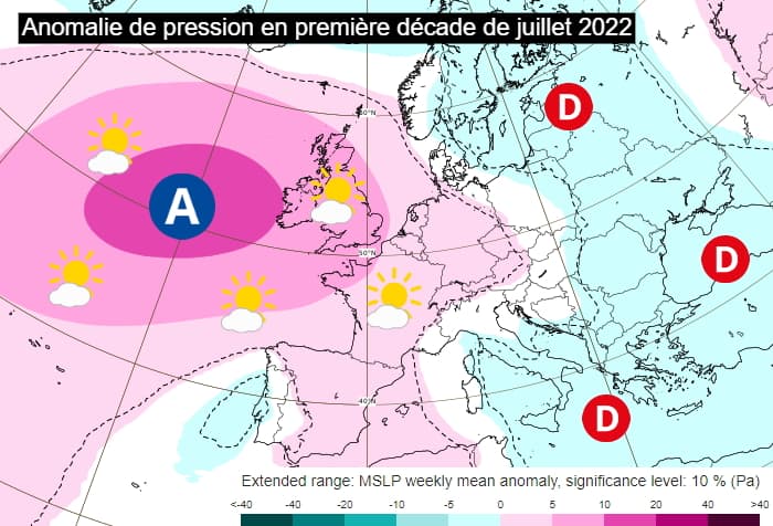 Modélisation de l'anomalie de pressions en première décade de juillet 2022 - via ECMWF