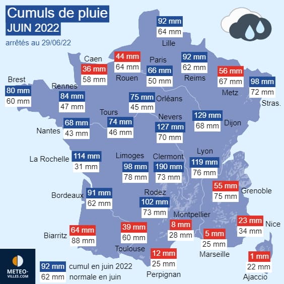 Cumuls de précipitations en juin 2022, arrêtés en date du mercredi 29 juin 2022 - Météo Villes