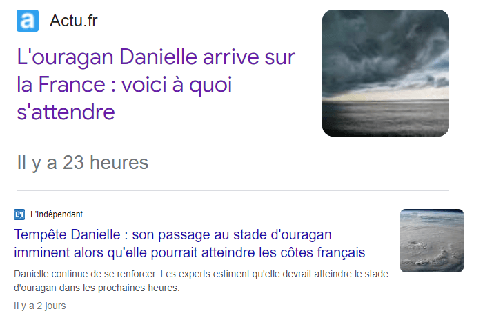 Exemples d'articles de presse traitant de l'ouragan Danielle - capture Google
