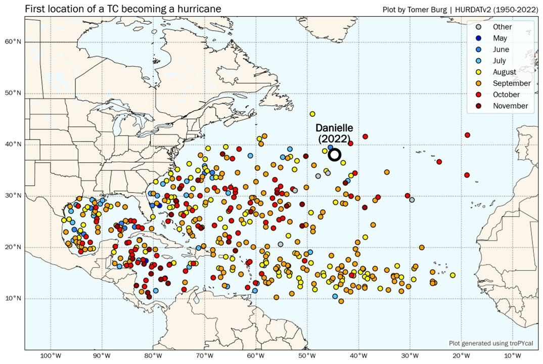 Il faut tout de même reconnaître que Danielle s'est formée sur une zone de l'Atlantique assez inhabituelle. Le phénomène a atteint le stade de l'ouragan autour d'une latitude de 38°N, ce qui bien plus au nord que la normale. Cependant, des formations encore plus septentrionales ont déjà été observées par le passé.