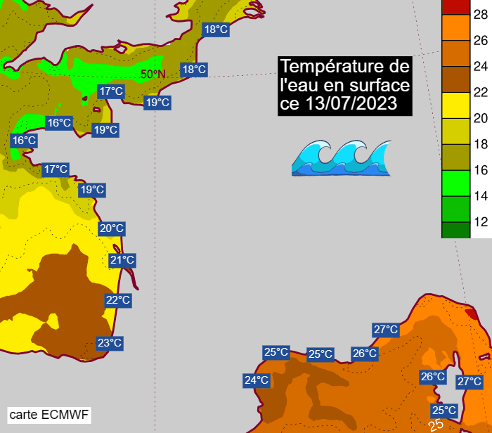 Températures de l'eau de mer en surface ce jeudi 13 juillet 2023 - via ECMWF