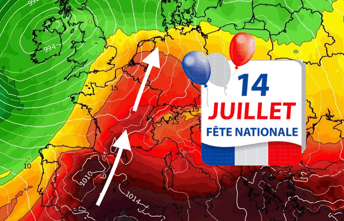 Ce vendredi de la Fête Nationale promet des conditions ensoleillées sur une grande partie de la France, sous l'impulsion d'un flux de sud-ouest se renforçant. Seuls la Bretagne et le Cotentin seront concernés par un front pluvieux en cours d'après-midi, sous un vent soutenu. En soirée, quelques averses pourront déborder sur la Normandie et jusqu'au Pas-de-Calais. Outre le soleil, la chaleur va s'accentuer très nettement par rapport à la veille. On prévoit entre 30 et 35°C sur les trois quarts de la France : autour de 32°C à Paris, 34°C en vallée du Rhône et 35°C vers la Garonne ! Des pointes de 36 à 37°C sont possibles vers les Landes. Au même moment, il ne fera que 20°C sous les pluies brestoises.