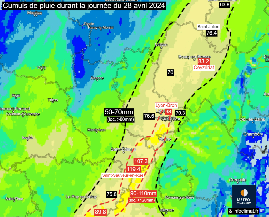 Ainsi, les cumuls journaliers se sont montrés parfois records sur ces secteurs, comme à Lyon-Bron, qui relève 74,1mm sur la journée climatologique du 28 avril (6h TU – 6h TU), battant largement l'ancien record journalier de 56mm le 22 avril 1948, une valeur qui est également située au-dessus de la moyenne mensuelle de précipitations (69mm).