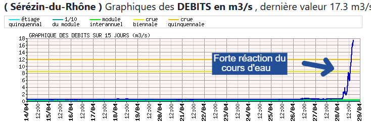 Des réactions et débordements de cours d'eau secondaires ont également été observés, comme le l'Ozon à Sérézin-sur-Rhône dont le débit a rapidement augmenté durant la journée pour dépasser celui d'une crue quinquennale.