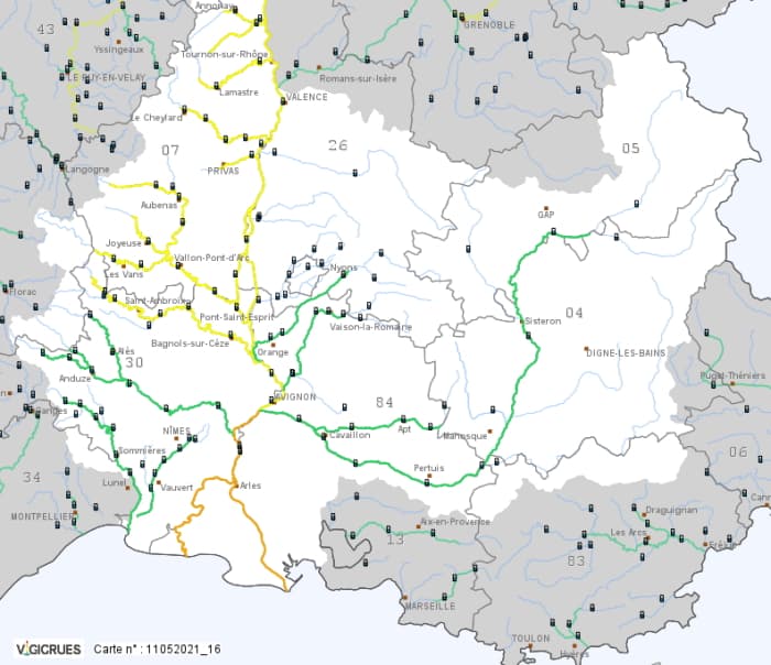 Carte de vigilance des crues en vigueur le mardi 11 mai 2021 à 16h - via Vigicrues
