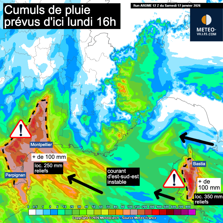 Les fortes pluies débuteront notamment ce vendredi 16 janvier 2026 sur les Cévennes puis elles gagneront tout le Languedoc samedi avant de s'étendre à la majeure partie des départements méditerranéens dimanche avec une activité plus prononcée sur les Cévennes et l'est de la Corse. Lundi, les plus fortes pluies devraient concerner l'Aude et les Pyrénées-Orientales et l'est de la Corse. En quelques jours, il devrait tomber fréquemment entre 150 et 300 mm des Cévennes au Roussillon ainsi que sur l'est de la Corse et la montagne ! Certains scénarios vont jusqu'à 400 mm, notamment dans les Cévennes héraultaises. Il conviendra donc de surveiller la réaction des cours d'eau.