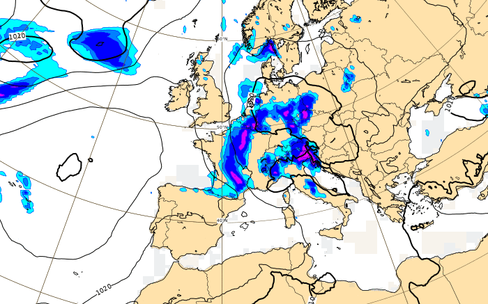 Le scénario du modèle européen est très proche. Il montre des pluies copieuses du Massif Central à la Champagne, de l'ordre de 20 à 50 mm. Sur l'est de la Franche-Comté, l'Alsace et la Lorraine, des accumulations de l'ordre de 70 à 100 mm sont également prévues avec des valeurs dépassant les 100 mm sur l'est de la Lorraine et le nord de l'Alsace, allant jusqu'à 175 mm sur le massif des Vosges !
