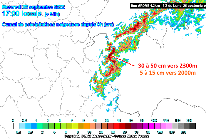 Cumuls de neige en montagne jusqu'au mercredi 28 septembre 2022 - via meteociel.fr