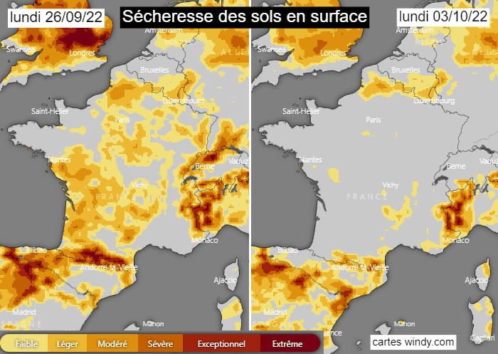 Sécheresse des sols en surface le lundi 26 septembre et le lundi 3 octobre 2022 - via windy.com
