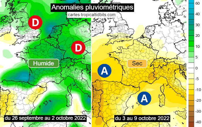 Il est indéniable que cette séquence humide se montre très bénéfique pour la sécheresse superficielle des sols. Notons cependant que cette sécheresse de surface évolue rapidement et qu'avec un déficit chronique de pluie depuis le début de l'année, les sols pourraient s'assécher assez rapidement en cas de nouvelle séquence anticyclonique. Or, c'est exactement ce qui se profile pour la semaine du 3 au 9 octobre 2022. En effet, l'anticyclone des Açores devrait s'étendre vers la France dès ce dimanche 2 octobre et pourrait dominer la semaine prochaine en apportant le retour d'un temps calme et sec sur le pays.