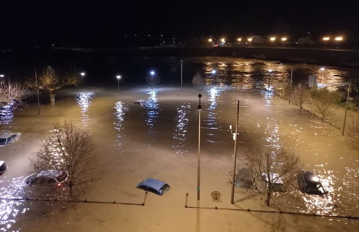 Parking totalement sous les eaux de la Garonne à Cazères (31) en nuit du 10 au 11 janvier 2022 - via Mairie de Cazères