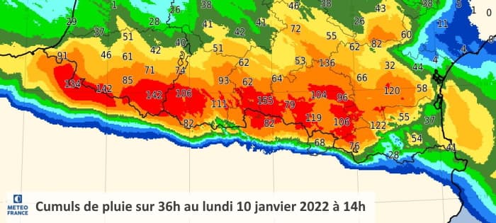 Les précipitations ont été particulièrement abondantes sur les départements pyrénéens les dimanche 9 et lundi 10 janvier 2022, conduisant à des crues et des inondations exceptionnelles dans plusieurs départements du sud-ouest.