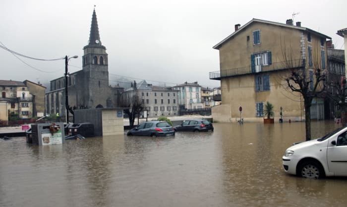 La place des Capots de Saint-Girons (09) inondée ce 10 janvier 2022 - photo Alain Arbogast / La Dépêche