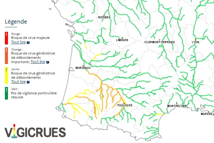 Au mardi 11 janvier 2022 en soirée, 8 départements du sud-ouest de la France étaient encore concernés par une vigilance orange en raison des crues. Il s'agit des Pyrénées-Atlantiques, des Hautes-Pyrénées, de la Haute-Garonne, du Gers, des Landes, de la Gironde, du Lot-et-Garonne et du Tarn-et-Garonne.