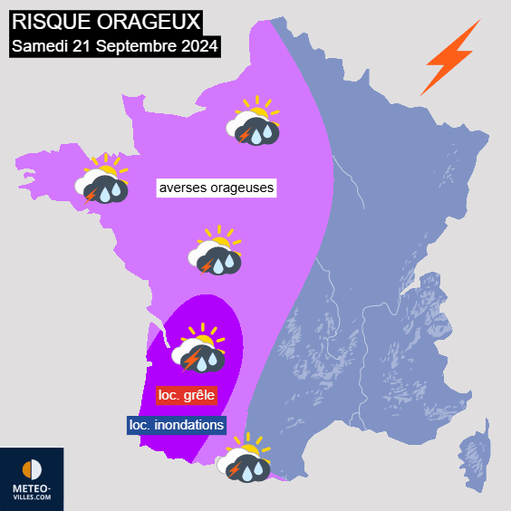 Cartes du risque orageux pour les samedi 21 septembre 2024 - Météo Villes