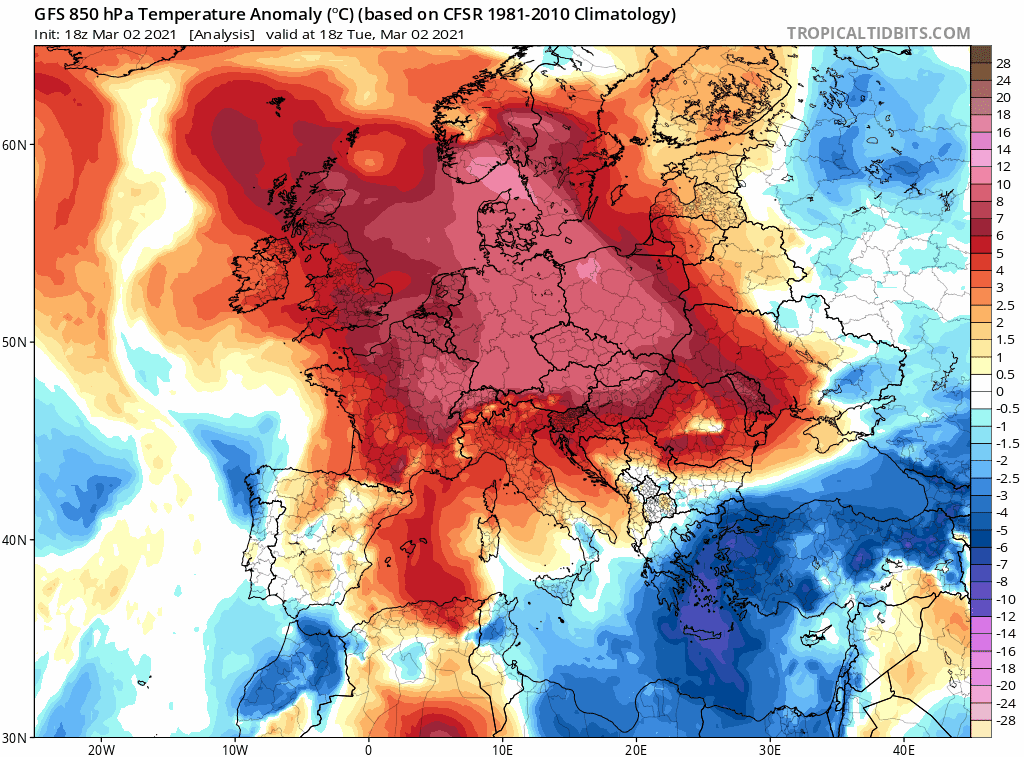 Malgré le rafraîchissement des prochaines heures, cette première semaine de mars se montre nettement plus douce que la normale. Le modèle européen envisage un retour à des valeurs plus proches des normales pour les trois prochaines semaines de mars 2021. De légères anomalies fraîches sont même modélisées pour la fin du mois en allant vers le nord-est de la France.