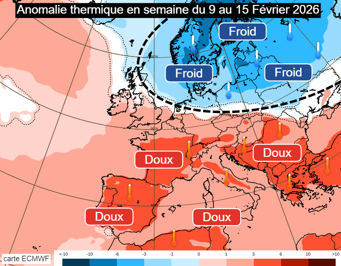 Anomalie thermique prévue en semaine du lundi 9 au dimanche 15 février 2026 - ECMWF