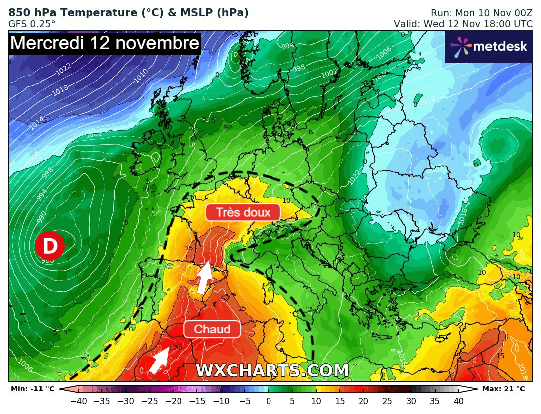Après un léger fléchissement ce week-end, les températures repartent à la hausse cette semaine sur la France avec un pic de douceur marqué attendu en seconde partie de semaine. En effet, le flux bascule au sud/sud-ouest en altitude à l'avant d'une vaste zone dépressionnaire sur l'Atlantique, permettant à de l'air particulièrement doux pour la saison en altitude de remonter de l'Afrique du Nord vers la France.